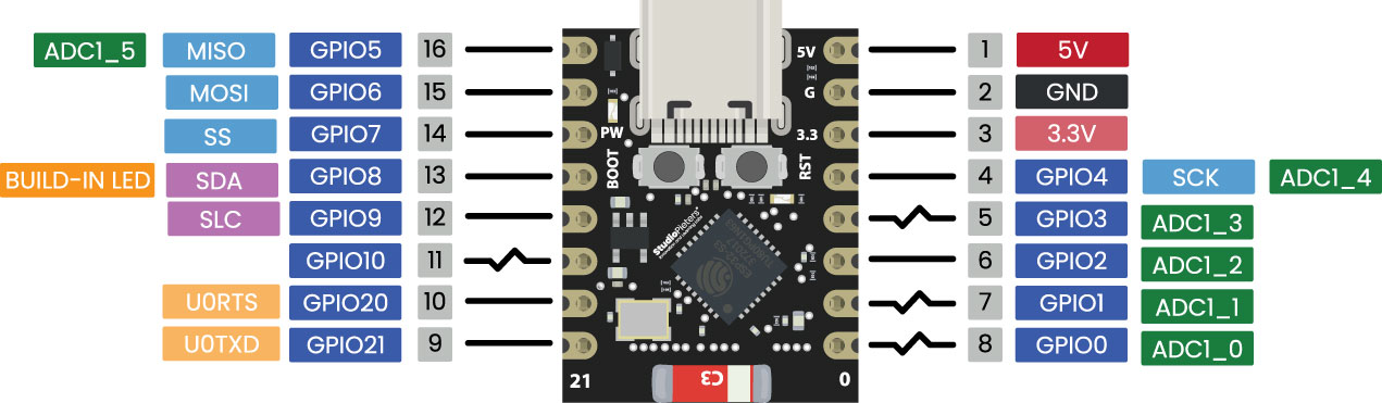 The ESP32-C3 Supermini is a compact development board with a USBβC connector and a number of GPIO pins. This development board is ideal for projects where space is a limiting factor and you don’t need the full feature set of the ESP32-S3.